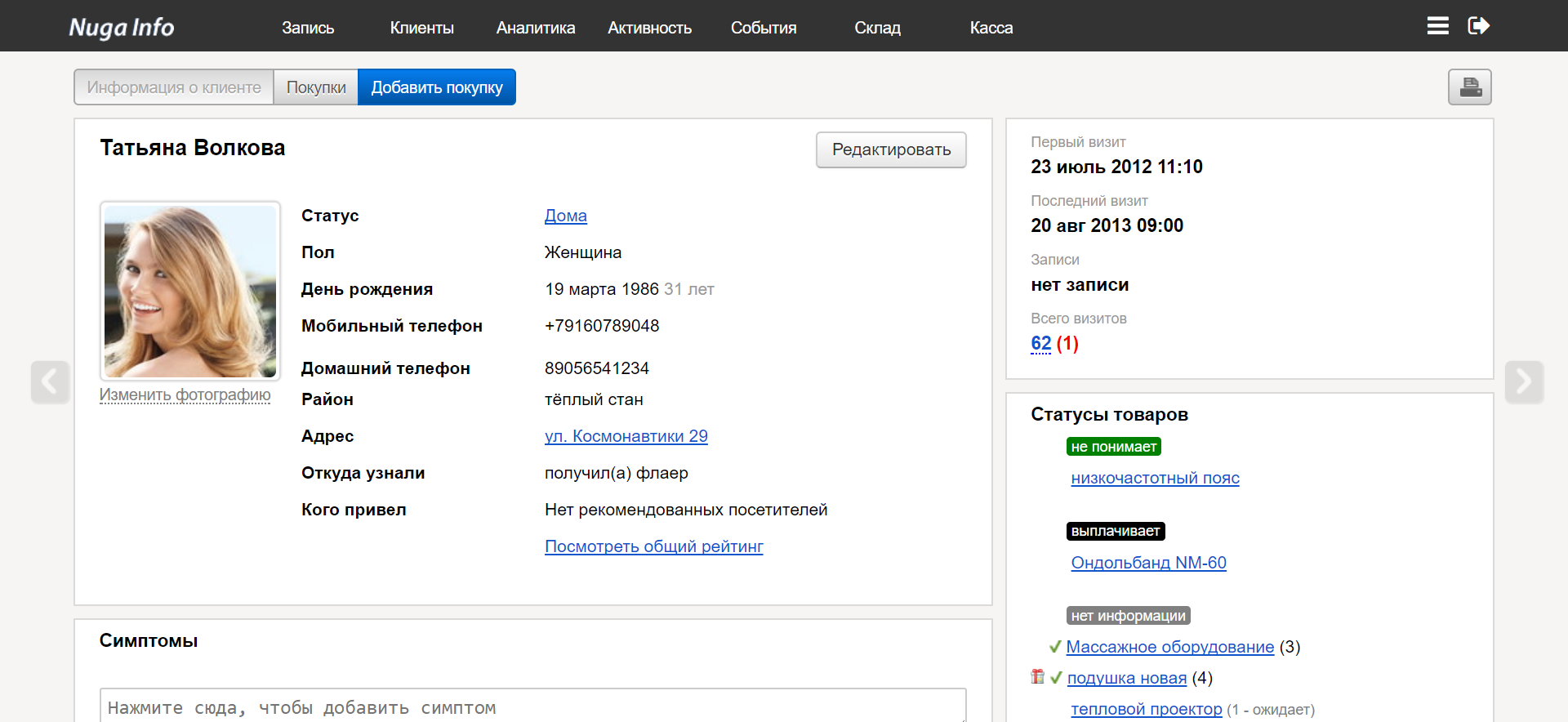 Все контакты клиента и его персональные данные. Возможность отследить связи с другими клиентами.